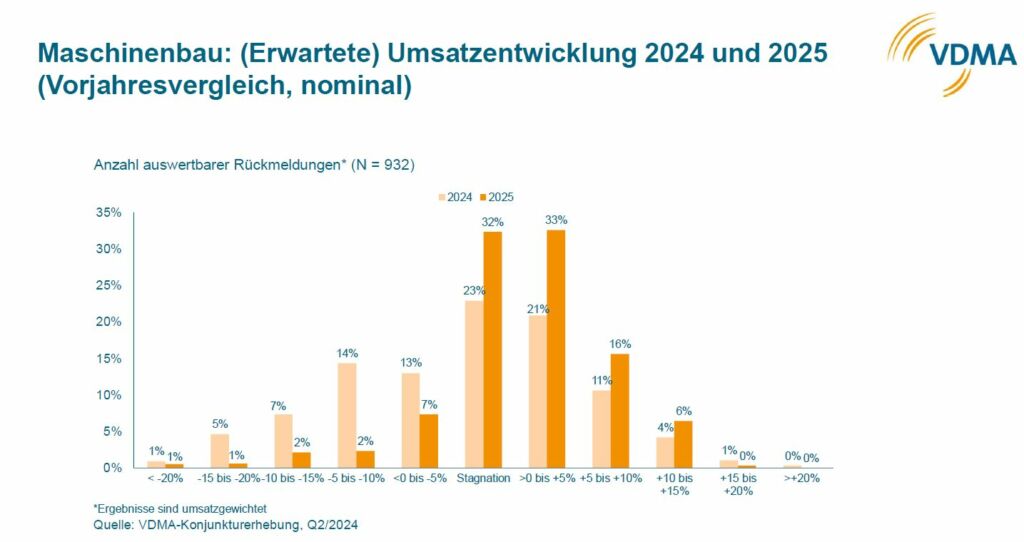Aufgrund der anhaltend herausfordernden Rahmenbedingungen zeigt sich in den Rückmeldungen der Unternehmen eine deutliche Investitionszurückhaltung. 36 Prozent der Befragten erwarten eine Stagnation ihrer nominalen Investitionen im laufenden Jahr, weitere 22 Prozent gehen sogar von einem Rückgang aus. Im nächsten Jahr könnte die Investitionsbereitschaft dagegen wieder steigen, wie die Ergebnisse nahelegen. Mehr als die Hälfte der Unternehmen erwartet ein Wachstum der Investitionen. „Gründe, zu investieren, gibt es angesichts der tiefgreifenden Transformation im Maschinenbau und in seinen Kundenbranchen zuhauf. Doch für eine Zunahme der Investitionen benötigt es gute Investitionsbedingungen, also Planungssicherheit und verlässliche wirtschaftliche wie politische Rahmenbedingungen. Diese Erkenntnis ist auch in der Politik angekommen. Nun muss endlich ernst gemacht werden mit einer Verbesserung der Angebotsbedingungen für investierende und innovationsstarke Unternehmen“, sagt der VDMA-Chefvolkswirt.