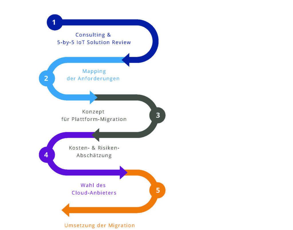 Auch ein 5×5 Assessment, wie es Device Insight anbietet, kann helfen. In diesem fünfstufigen Prozess wird eine aktuelle Anwendung kartiert, es werden Schwachstellen und Optimierungspotenziale identifiziert. Der Prozess beginnt mit einer Überprüfung der bestehenden Architektur, um die Anforderungen und notwendigen Clouddienste systematisch zu erfassen. Darauf folgt das Mapping der technischen und geschäftlichen Anforderungen, an das sich die Erstellung eines Konzepts für die potenzielle IoT-Migration anschließt. Im vierten Schritt wird der geeignete Cloud-Anbieter – meist Microsoft Azure oder AWS – ausgewählt.