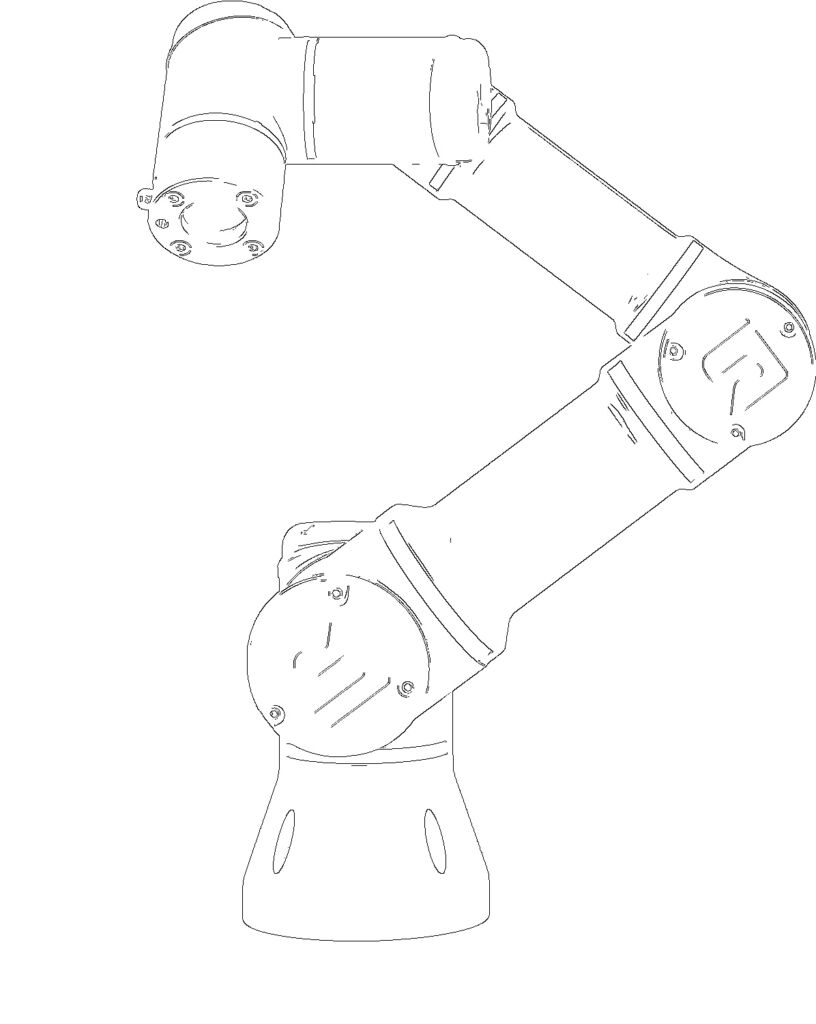 Damit das Bild vom Cobot gezeichnet werden kann, sind zunächst mehrere Bildverarbeitungs-Schritte notwendig. Ziel ist es, das Bild so umzuwandeln, dass nur die wichtigen Kanten übrig bleiben. Für die Bildverarbeitung greifen mehrere Algorithmen ineinander. Zunächst wird das Bild in ein Schwarz-Weiß-Bild umgewandelt. Anschließend wird der Weichzeichner Gaussian Blur angewandt, um Bilderrauschen, Artefakte und kleinere Details zu entfernen. Danach kommt der Canny-Algorithmus (Canny Edge Detector) zum Einsatz: Dieser prüft jeden einzelnen Pixel darauf, wie stark sich dieser von seiner Umgebung abhebt. Pixel, die sich stark abheben, werden als Kante erkannt, alle anderen Pixel werden entfernt. So entsteht ein Schwarz-Weiß-Bild, das ausschließlich relevante Kanten enthält (siehe Zeichnung).