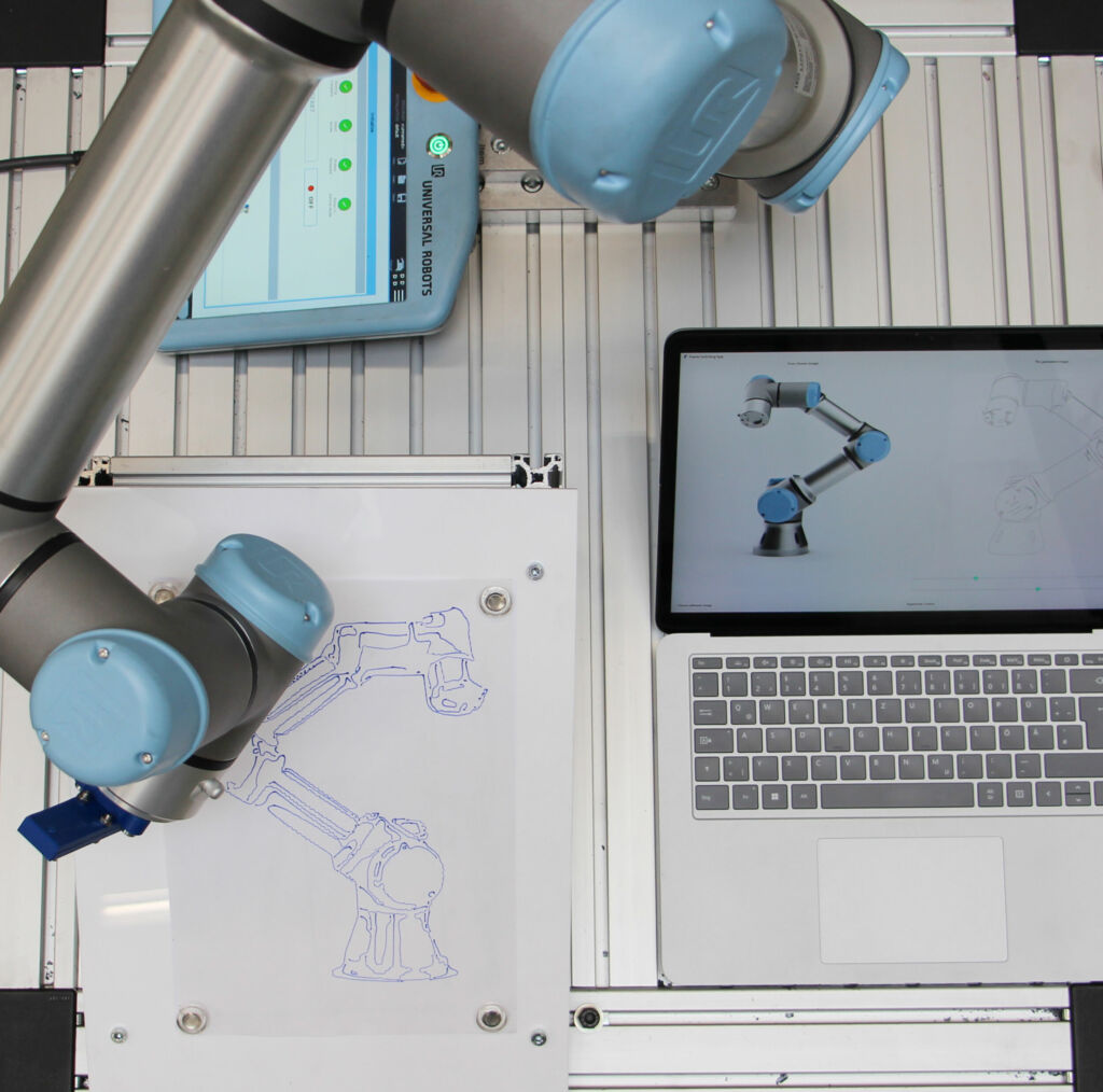 Anschließend erstellt die KI den Programmiercode für den Cobot, der damit das Bild möglichst effizient zeichnen kann. Das Ziel ist es, nicht für jeden Pixel eine eigene Bewegungsanweisung zu erstellen, sondern so viele Pixel wie möglich in einer einzelnen Bewegung zu zeichnen. Die Zeichnung erfolgt also nicht Punkt für Punkt, sondern in langen, verbundenen Linien – überflüssige Bildfragmente werden weggelassen. Die KI trifft dabei die Entscheidungen, welche Bildpunkte tatsächlich relevant sind und welche entfallen werden können.